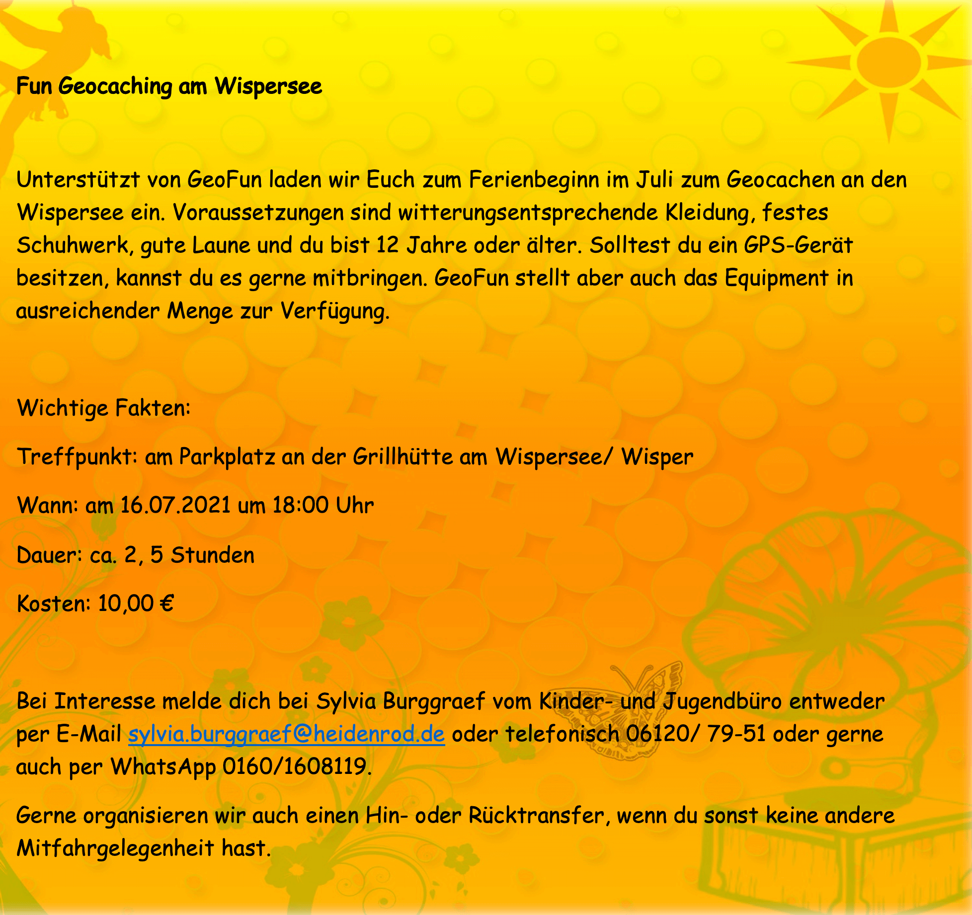 Bei Interesse melde dich bei Sylvia Burggraef vom Kinder- und Jugendbüro entweder per E-Mail sylvia.burggraef@heidenrod.de oder telefonisch 06120/ 79-51 oder gerne auch per WhatsApp 0160/1608119.