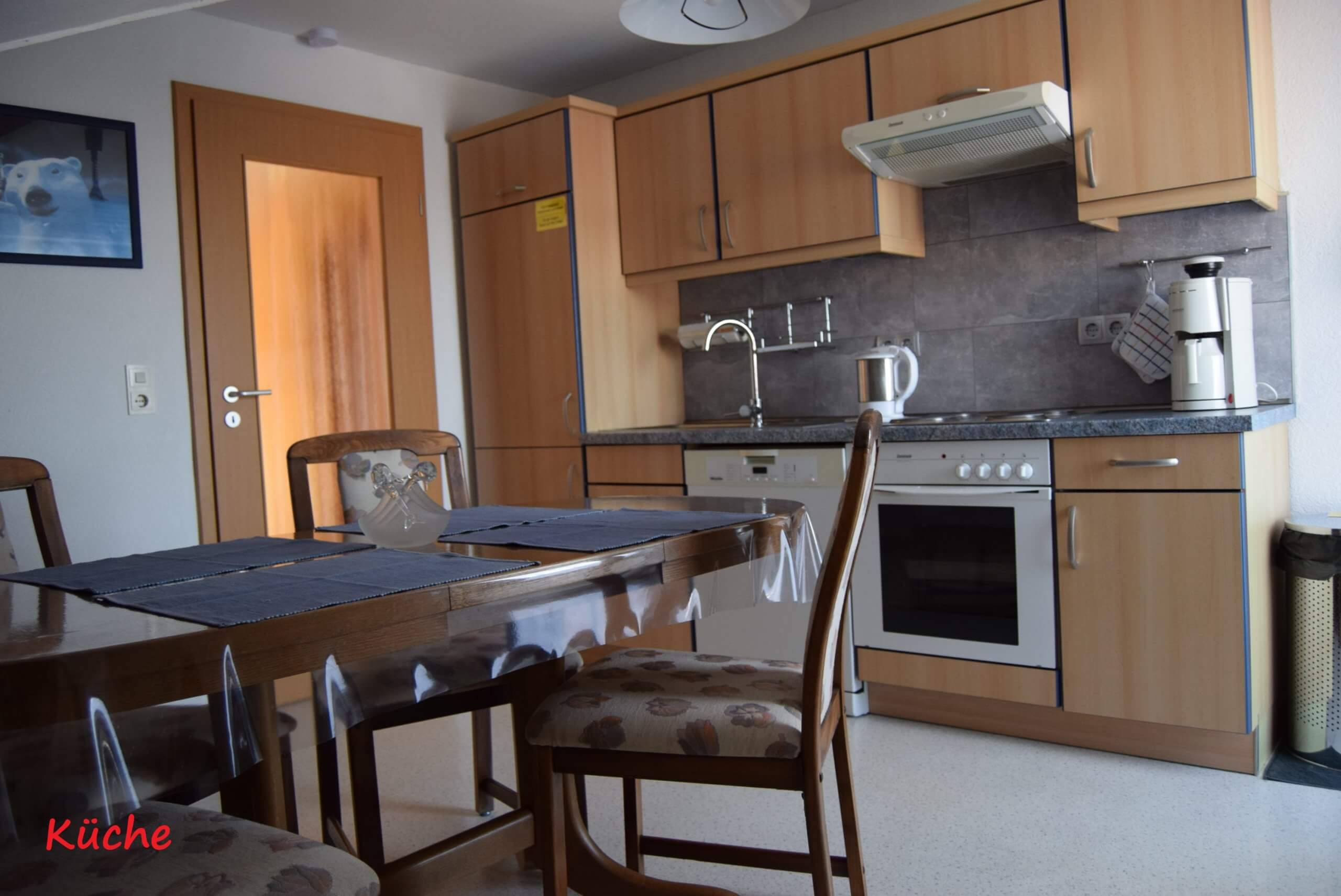 1 Küche mit Essecke (Hausrat für 6 Personen) sowie Spülmaschine, Toaster, Kaffeemaschine, Wasser- und Eierkocher und Balkon;